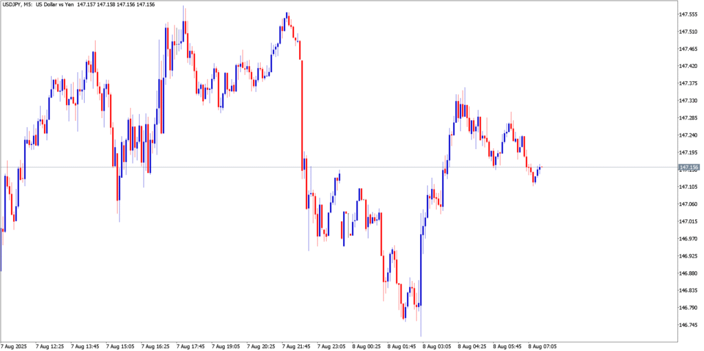 The M5 chart shows USD/JPY trading within a rising channel, reflecting a short-term bullish trend. The pair has been posting higher lows and higher highs since the start of the week, with buyers consistently stepping in on dips. However, we can see that around the 147.50 – 147.80 area, upward price action has stalled repeatedly – evident from the cluster of candle wicks and sideways movement near that zone. This corresponds to a known resistance ceiling. The bulls’ inability so far to secure a foothold above 148.00 underscores the importance of that barrier: USD/JPY needs to break and hold above ~148.0 to unleash another leg of sustainable upside. Until then, the risk of a pullback persists. On the downside, immediate support can be identified around 146.4 – 146.5, which is roughly where the lower bound of the channel lies and where the pair last bounced earlier today. In fact, the technical forecast for today anticipated an initial dip toward 146.45 support followed by a bounce, and this scenario has been playing out with intraday oscillations. A drop below that level would test the integrity of the channel – notably, a break beneath 145.55 (yesterday’s low and a minor support) could invalidate the bullish setup and signal a deeper correction. If 145.5 gives way, the next significant support is around 143.6 (a level mentioned as a potential target on a breakdown), which coincides with late July lows. Candlestick patterns on the M5 chart show some indecision at the top: small-bodied candles and upper wicks near 147.7 hint at buying momentum waning. Yet, there’s no dramatic bearish reversal pattern visible – more a consolidation. A noteworthy pattern is the tight consolidation (a miniature triangle flag) forming just under 147.5, which could precede a breakout one way or the other. The Relative Strength Index on short-term charts has cooled from overbought levels, potentially giving bulls a bit more room to run if they choose another assault on 148.