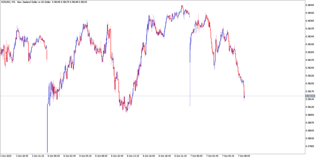 The NZD/USD chart is deeply bearish. The pair has tumbled to multi-month lows in the mid-0.59 area. Immediate resistance is near 0.59–0.60 (former support); a failure to reclaim 0.60 suggests the downtrend will resume. On the downside, support now sits around 0.585–0.580; a break below 0.580 would open the path toward the mid-0.57s. (In practice, price action looks rangebound for now between ~0.58–0.60, but bias is clearly lower.)