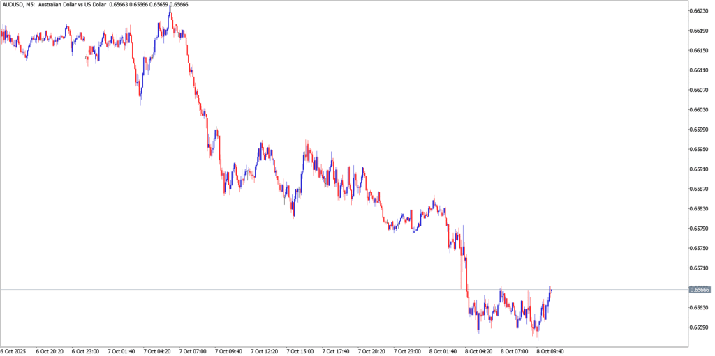 AUD/USD’s 5-minute chart shows a market caught in limbo, with a slight bearish tilt. After a gentle relief rally in late September that lifted the pair toward the key $0.6600 level, bullish momentum stalled out. The chart reveals clear resistance just above 0.6600, where the Aussie’s advance repeatedly fizzled out in a cluster of M5 candles with short bodies and upper wicks – a sign of buyers lacking follow-through. Since peaking near 0.6610, the pair has drifted into a sideways consolidation between roughly 0.6580 and 0.6620, marked by choppy back-and-forth price action. The 0.6600 handle has essentially become a magnet, with price oscillating around this pivot as neither bulls nor bears show strong conviction intraday. Crucially, the short-term bias is turning downward: successive minor lower highs point to building selling pressure, and a slip below $0.6575 (the bottom of the recent range) would signal a bearish break from this consolidation. That could accelerate declines toward the mid-0.6500s – the September 26 swing low around 0.6520 is an initial downside target. On the upside, any rebound faces an immediate test at 0.6630 (range top), with a stronger ceiling at the late-September high near 0.6700. Momentum on the M5 timeframe has been flat, with the RSI flitting around neutral 50 as price coils. But if risk aversion intensifies, watch for the Aussie to break decisively lower out of this range. A downside resolution would confirm that bears are seizing control, whereas a punch through 0.6630 would be needed to give Aussie bulls a spark of hope.