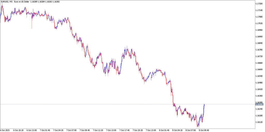 EUR/USD’s 5-minute chart underscores a sharp bearish bias. The pair has been carving out lower highs and lower lows, accelerating into a downtrend that gained steam in late September. A steep sell-off drove the euro from the mid-$1.17s down to around $1.1650, where it tentatively found support at a one-month low. This 1.1645 area now forms a key intraday floor – the bears tested it as selling peaked, and a failure to crack it led to a brief consolidation. Any relief rallies have been shallow; attempts to recover above $1.1700 were swiftly faded, marked by long upper wicks on M5 candles as sellers pounce on upticks. Immediate resistance lies around $1.1700–1.1730 (the prior support zone and descending trendline region), and as long as the euro stays capped below that, the downside bias remains intact. A break under $1.1645 would be a bearish breakout, opening the door to the next support at $1.1610 and possibly $1.1575 (early September lows). Momentum indicators on these lower timeframes show persistent weakness – bearish momentum is dominant, with no sign of a reversal yet. Unless euro bulls decisively reclaim the high-$1.17s, the path of least resistance points lower, with any intraday bounces likely to be sold into.