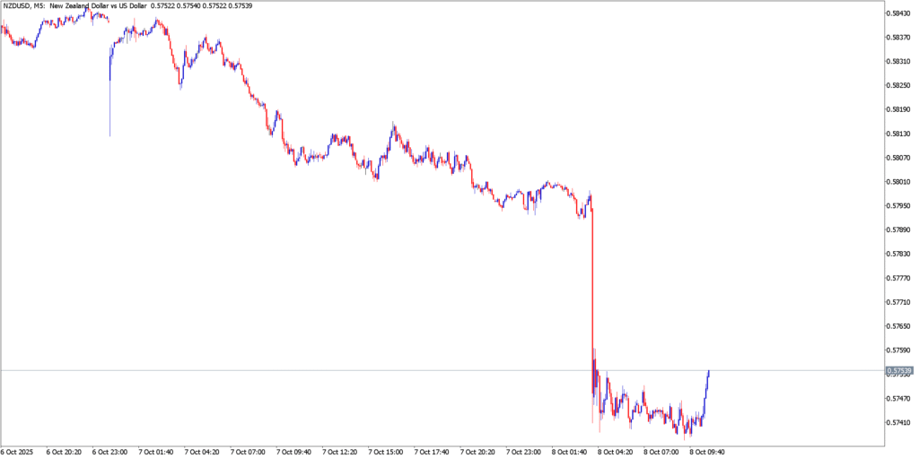 NZD/USD’s 5-minute chart encapsulates a dramatic momentum shift and heightened volatility. In the lead-up to the RBNZ decision, the pair was already trending lower, posting a series of lower highs that reflected building selling interest. The rate cut announcement then unleashed a violent downward thrust on the M5 chart – a massive bearish candlestick knifed through support levels, as NZD/USD collapsed by dozens of pips in minutes. This whipsaw price action is evident on the chart: a sharp spike (volatility on news) followed by a free-fall that broke the Kiwi to fresh lows. In the aftermath, the pair has struggled to find its footing. Brief attempts to bounce have been tepid and short-lived, capped by resistance now forming around the $0.5800 mark (a level that formerly provided support before the breakdown). The M5 candlesticks show large wicks and erratic swings, underscoring a jittery market – but importantly, each recovery attempt is met with new sellers, keeping NZD/USD heavy. The near-term support is elusive until the day’s low around $0.5740, and below that the focus turns to psychological support at $0.5700. On such a short timeframe, momentum oscillators remain oversold, but that alone hasn’t induced a turnaround; instead, it highlights the intense downward momentum that persists. Unless the Kiwi can reclaim levels above $0.5850 and form a base, the technical picture favors the bears. Traders should be prepared for continued volatility – the rate cut-fueled sell-off may evolve into a lower consolidation, but any negative news or further dovish hints could spark another leg down. Only a clear stabilization above initial resistance (and a calming of broader market fears) would signal that NZD/USD is ready to bottom out from this slide.