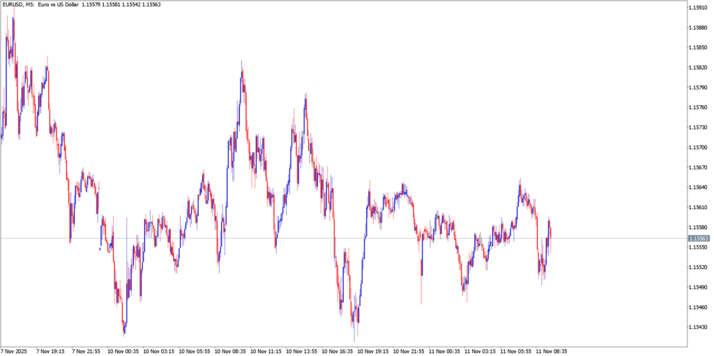 On the 5-minute EUR/USD chart, price action was largely range-bound as traders digested mixed cues. The pair spent the session oscillating roughly between $1.1530 support and $1.1570 resistance, failing to sustain any breakout. Early in the day, euro-dollar attempted a modest rise, but bullish momentum faded near the 1.1560s – around the prior session’s peak. A lack of follow-through above 1.1570 signaled persistent overhead supply. Conversely, dips toward the mid-1.15s found buyers. Notably, support around $1.1535 (just above the day’s low) held firm, aligning with minor demand seen on the chart. The 5-minute candlesticks show no dramatic spikes, reflecting the subdued volatility. By the U.S. afternoon (when liquidity was lower due to the holiday), EUR/USD was drifting near $1.1550, essentially unchanged from its European open. Technical indicators suggested a neutral intraday bias – with short-term moving averages flattening out – as neither bulls nor bears seized control. In summary, EUR/USD’s trend was flat on the session, respecting its established range amid an absence of a decisive catalyst.