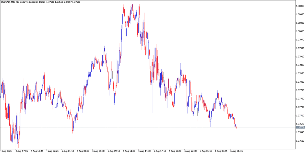USD/CAD’s chart (5-minute) illustrates a consolidative pause just under the 1.3800 mark, as the pair digests its recent upswing. After five consecutive days of gains into end-July, USD/CAD touched the high-1.38s early this week before momentum stalled. The 1.3800 level has acted as a psychological barrier, with bulls unable to secure a daily close above it. We see a modest pullback from the 1.3810 area (the recent swing high) down to the 1.3750–1.3760 support zone in overnight trading. This area aligns with the 5-minute chart’s visible lows and has so far contained the dip. Short-term bias remains mildly bullish – the pair is still posting higher lows, and a potential bullish flag pattern may be forming just below resistance. Key resistance is evident at 1.3800–1.3820 (recent highs); a decisive break there would expose the next upside targets around 1.3900, a zone of strong resistance highlighted by prior highs. On the flip side, if 1.3750 support gives way, the next support levels to watch are around 1.3700–1.3720, and below that the 1.3585 region (bullish invalidation on a daily closing basis). Technical indicators (e.g. RSI) on higher timeframes remain in bullish territory after breaking out from neutral, suggesting buy-on-dips mentality could persist unless a catalyst reverses the trend.