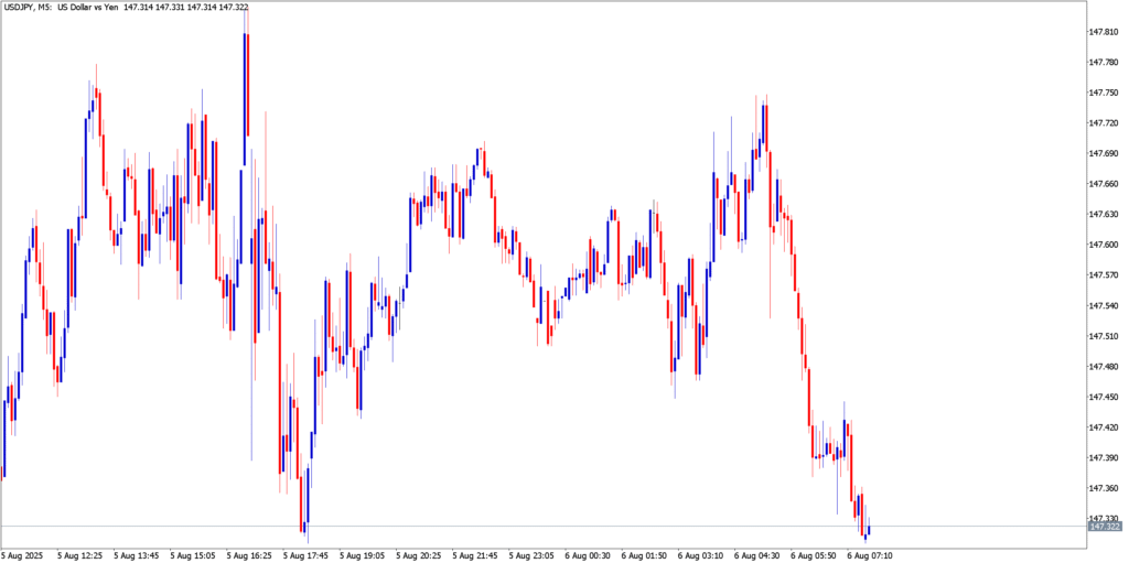 USD/JPY’s 5-minute chart reveals choppy action as the pair oscillates in the mid-147s, constrained below recent highs. After an initial surge, dollar-yen failed to clear the ¥147.80 resistance (a level that aligns with late-July swing highs) and has since eased back toward ¥147.30. The short-term trend is lackluster – rallies are struggling to sustain, evidenced by lower highs on the intraday chart after each push toward ¥147.8. Key resistance overhead lies at ¥147.80–148.00; this zone halted the advance yesterday and marks the ceiling of the week’s range. Beyond that, ¥148.50 and ¥149.00 loom as further resistance, but market participants are acutely aware that any move toward ¥150.00 could trigger official alarm. On the support side, minor support is seen around ¥147.00–147.20 (where the dollar found bids earlier in the week). Below there, the ¥146.60–146.80 region is noteworthy – it corresponds to previous breakout levels and was cited as support in technical analyses. A drop under ¥146.60 would indicate a short-term trend reversal to the downside, potentially exposing ¥145.00–145.50 next. For now, however, the pair remains range-bound, reflecting a tug-of-war between USD strength and JPY safe-haven demand.
